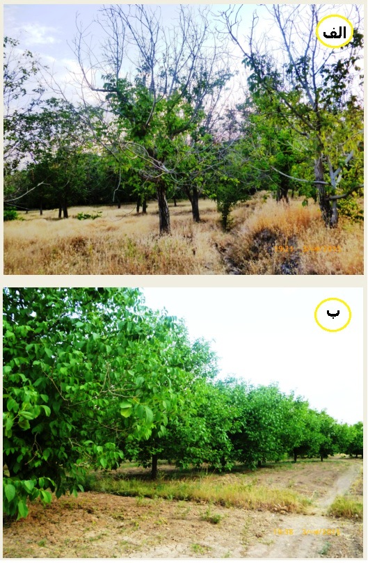 شکل 1: الف) خسارت وارده به برخی از باغ های گردو به دلیل خشکسالی و عدم تأمین نیاز آبی، سرما زدگی و بی توجهی در داشت. ب) نمونه از باغ های که در طی دوره خشکسالی و سرمازدگی نیاز آبی درختان تأمین و به داشت آنها توجه لازم صورت گرفته است. (تویسرکان 13مرداد 1394). آب مورد نیاز برای آبیاری مقدار آب مورد نیاز و تعداد آبیاری در باغ های گردو بستگی به سن درخت، نوع خاك، مقدار بارندگي طی دوره رشد، پراكنش درختان در واحد سطح، و سيستم مديريت خاك دارد. که تعیین آب مورد نیاز درختان گردو با توجه به موارد فوق بسیار دشوار است در بیشتر منابع مقدار آب مورد نیاز درختان گردو با توجه به سن در هکتار ارائه شده است (دو ستون اول جدول 1) با توجه به اینکه معمولاً درختان غیر پیوندی را با فاصله تقریبی 10 متر کشت می کنند بنابراین در هر یک هکتار باغ گردو حدود 100 درخت گردو کشت می شود که این تعداد برای درختان پیوندی با فاصله 7 متر، به حدود 204 درخت در هر هکتار افزایش می یابد با وجود دو ستون اول جدول مذکور و تعیین پراکنش درختان گردو در واحد سطح می توان آب مورد نیاز هر درخت را در سنین مختلف به شرح ستون سوم و چهارم جدول 1 به طور تقریبی تعیین کرد. جدول 1: تغييرات مصرف آب درختان گردو در يك هكتار باغ و هر درخت بر حسب سن