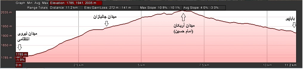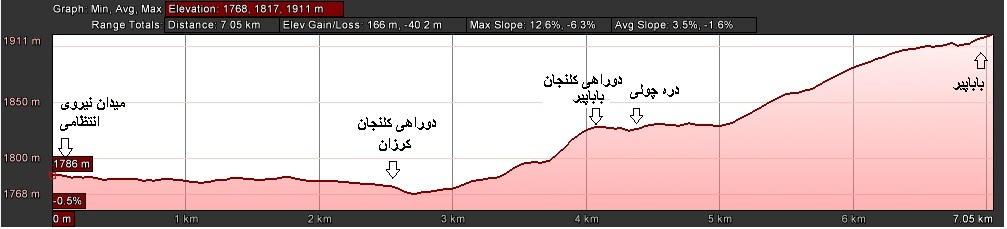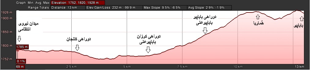 بر اساس داده های ارائه شده در جدول 1 طول این مسیر 7 کیلومتر می باشد. میانگین شیب در کل مسیر 3.6 درصد و حد اکثر شیب آن در برخی قطعات که مسافت کوتاهی را در بر می گیرند به 10 درصد می رسد کمترن ارتفاع این مسیر در میدان نیروی انتظامی و بیشترین ارتفاع در مرکز روستای باباپیر قرار دارد. مجموع قطعات دارای شیب بیش از 5 درصد این مسیر حدود 1.4 کیلومتر است (شکل 4).