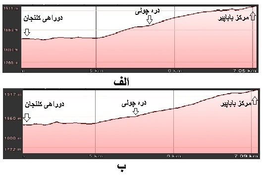 شکل 5: نیمرخ طولی جاده پایین از دوراهی کلنجان تا باباپیر الف: از مسیر دزله ب: از مسیر خرمن جا