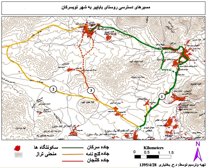 شکل 1: مسیرهای دسترسی روستای باباپیر به شهر تویسرکان