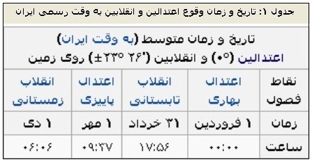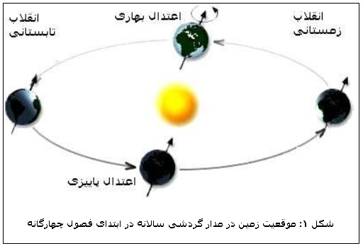 در شکل 1 موقعیت زمین نسبت به خورشید در مدار انتقالی سالانه در ابتدای فصول چهار گانه مشخص شده است که آغاز فصول بهار و پاییز منطبق بر اعتدال بهاری و پاییزی و آغاز فصول تابستان و زمستان منطبق بر انقلاب تابستانی و زمستانی می باشد.