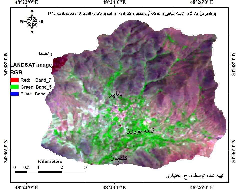 شکل 1: پراکندگی باغ های گردو (پوشش گیاهی) در حوضه آبریز باباپیر و قلعه نوروز در تصویر ماهواره لندست 8 آمریکا مرداد 1394 با توجه به سطح زیر کشت محاسبه شده برای باغ های گردو در محدوده مورد مطالعه در صورتیکه آب استحصالی کشاورزی فقط برای آبیاری باغ های گردو مورد استفاده قرار گیرد می تواند 439.3 میلی متر (73 %) از نیاز خالص آبیاری (600میلیمتری) سطح زیر کشت کنونی را برطرف سازد. و برای برقراری تناسب بین حجم آب قابل استحصال کشاورزی و رفع نیاز خالص آبیاری باغ های موجود راه کارهای زیر وجود دارد. الف) کاهش سطح زیر کشت: با شرایط فوق در صورت کاهش 51.2 هکتاری (27%) سطح زیر کشت تناسب لازم بین آب استحصالی و رفع نیاز خالص آبیاری باغ های گردو با وقوع بارندگی در حد میانگین (405 میلی متر) برقرار می شود در این صورت کشاورزان باید از آبیاری 27 درصد از باغ های کنونی صرف نظر کنند که در عمل با توجه به زحمات و هزینه ای که طی چند سال متحمل شده اند و امیدی که به آینده دارند با کاهش نوبت آبیاری سعی بر حفظ تمامی سطح زیر کشت دارند ذر نتیجه هر ساله خسارت زیادی را به دلیل عدم تکافوی منابع آبی و طولانی شدن فاصله آبیاری در فصل گرم که تنش آبی شدیدی برای درختان گردو به دنبال دارد متحمل می شوند. ب) افزایش بازده آبیاری: محاسبات فوق با بازده آبیاری 35 درصد صورت گرفته است با بهسازی شبکه انهار و افزیش بازده انتقال و همچنین بهره گیری از سیستم های نوین آبیاری در صورتی که بازده آبیاری به 48 درصد افزایش یابد تناسب بین حجم آب استحصالی و رفع نیاز آبیاری باغ های گردو حاصل می شود و با بازدهی بیش از این میزان امکان کشت سایر محصولات نیز در زمین های بایر فراهم می شود.که در خشک سالی ها نیز می تواند سبب کاهش خسارت ناشی از تنش آبی به باغ ها شود. بنابراین جهت کاهش خسارت به کشاورزان در حوضه آبریز باباپیر و قلعه نوروز انجام اقدامات زیر ضروری به نظر می رسد: 1 – هیچ نهال جدیدیدی که منجر به توسعه سطح زیر کشت می شود کاشته نشود 2 – در صورت امکان از آبیاری درختان گردو که به صورت پراکنده در فاصله زیادی نسبت به مبع آب قرار دارند خود داری شود تا سایر باغ ها با فاصله 12 روزه به طور کامل آبیاری شوند. 3 – با توجه به اینکه با گذشت زمان و گسترده شدن تاج درختان کنونی نیاز آبی انها نیز افزایش می یابد جهت حفظ حداکثری سطح زیر کشت کنونی برنامه ریزی در زمینه بهبود شبکه انتقال آب از منبع به باغ ها و استفاده از شیوه های آبیاری نوین اجتناب ناپذیر است.که این مهم از طریق دریافت تسهیلات از جهاد کشاورزی و خود یاری کشاورزان امکان پذیر است. موضوعات مرتبط: کشاورزی و باغداری برچسبها: باباپیر, روستای باباپیر, تویسرکان, قلعه نوروز [ چهارشنبه هجدهم فروردین ۱۳۹۵ ] [ 22:54 ] [ حسین بختیاری ]